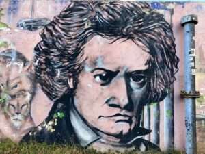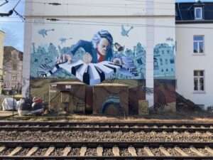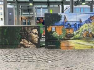 The great composer can also be seen on walls and electrical boxes: the wall of the railway station mission is decorated with Beethoven. Another mural can be viewed above the railway tracks at the corner of Kaiserstraße and Weberstraße. There are even two large murals in the Beuel district (Anniversary year: Street art in Bonn honors Beethoven – meikemeilen -).