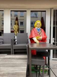If you walk through the city with your eyes open, you will not only find the large Beethoven statue on Münsterplatz, but also many Beethoven figures by Ottmar Hörl (in gold, green, purple, or blue), which were created to mark the 250th anniversary of Beethoven’s birth and show the young, smiling Beethoven. (Beethoven Model 2019| Work | Ottmar Hörl). Beethoven looks down on passers-by not only from shop windows, but also from balconies and canopies.